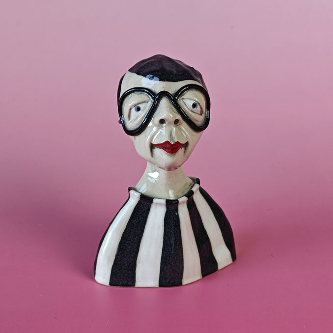Glad Snob i hvid og sort stribet bluse og sorte briller og hår.